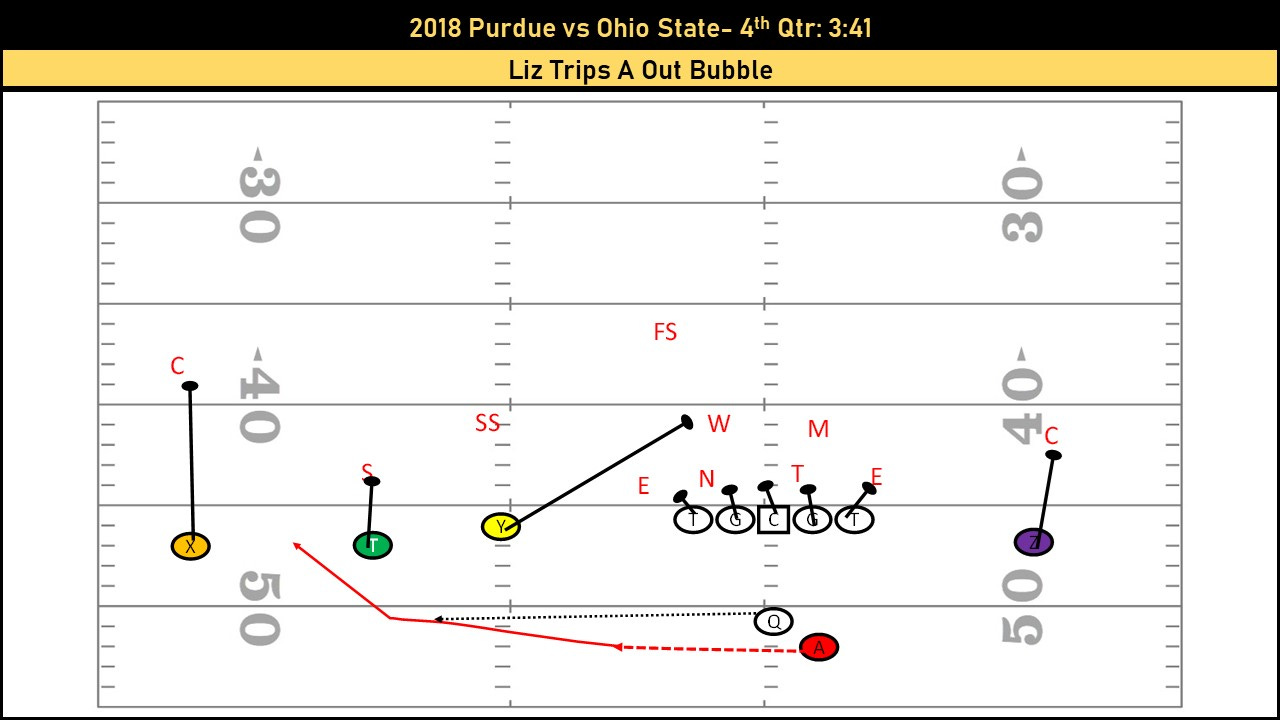 Finally we see another way that Purdue took advantage of Ohio State’s man coverage. Purdue put their electric (and now NFL/ Arizona Cardinal) Rondell Moore at running back and found a creative way to get him the ball. Knowing that the Buckeyes were in man to man they threw a bubble to Moore while cracking with their receivers to account for the man who was trying to cover Moore. Add in some poor tackling and this sealed the deal for the Boilermakers upset of the #2 Buckeyes.