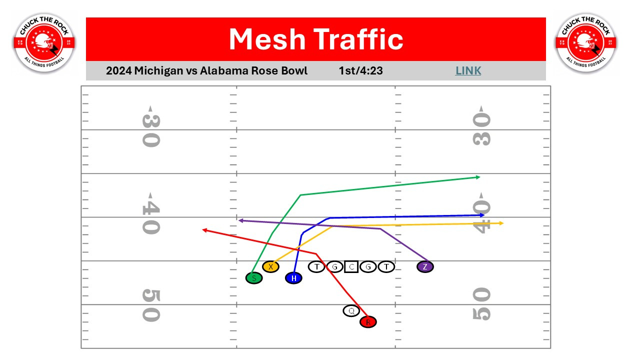 The Mesh Pass concept features crossing routes with options attached to each route. Typically the running back is also released on a route and is part of the progression. On the Mesh Traffic concept the running back becomes the intent. This concept has become incredibly popular in the low red zone when defenses feature a heavy dose of man coverage. The crossing routes create picks or traffic for the defense to try and run through while the running back leaks to the flats, often times crossing the formation, ideally wide open for a walk in touchdown.