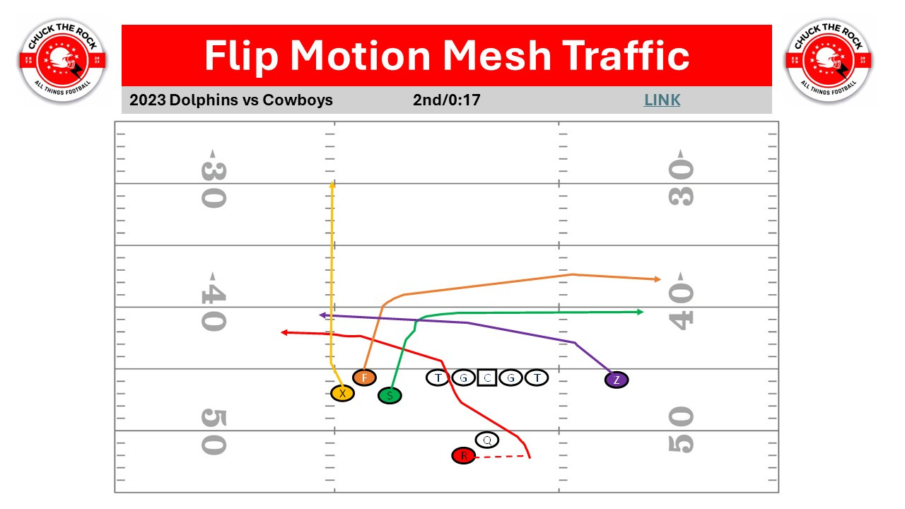 Another NFL example on this clip as the Miami Dolphins add a wrinkle to the Mesh Traffic concept. They run a flip motion where the running back goes in motion to the opposite side, making it seem like he is going to leave the backfield before coming back underneath the quarterback. One common thing that you see on most of these clips is that the running back goes inside the offensive tackle who is pass setting deep, which helps him get lost in the scheme.