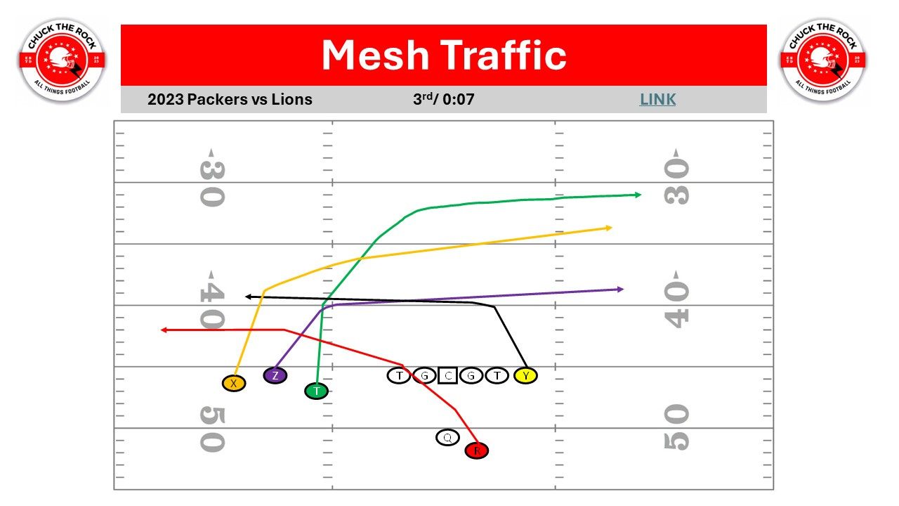 The NFL loves Mesh Traffic in the red zone and this example here shows the 2021 Green Bay Packers where Aaron Rodgers and Aaron Jones hooking up for their third touchdown of the game. The Packers go with a condensed set to make defenders run through a lot of interference which opens up Jones for the walk in touchdown.