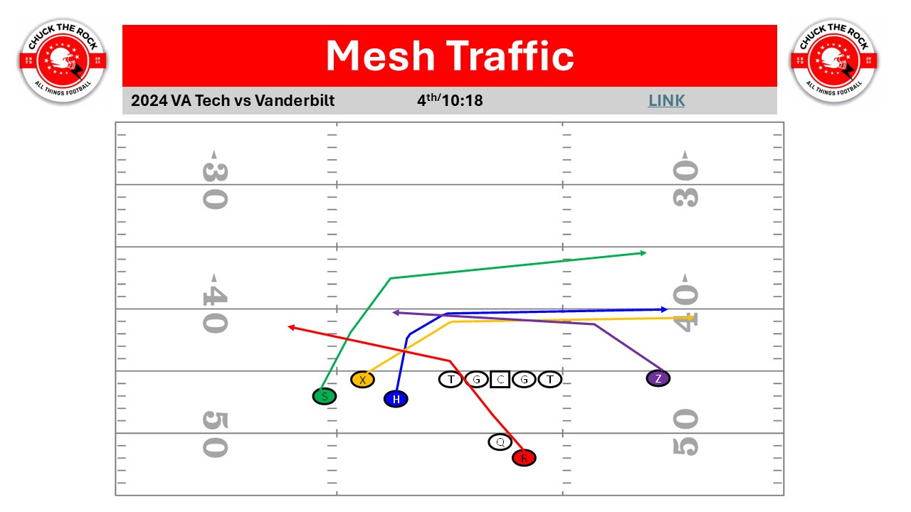 2024 Virginia Tech running a Mesh Traffic on 3rd and Goal on the 11 yard line. The Hokies line up with a condensed set, but not nearly as tight as the next examples we will see. Vanderbilt is bringing pressure which opens the back up right away. The quarterback dumps it off in a rush and the running back is able to walk in untouched.
